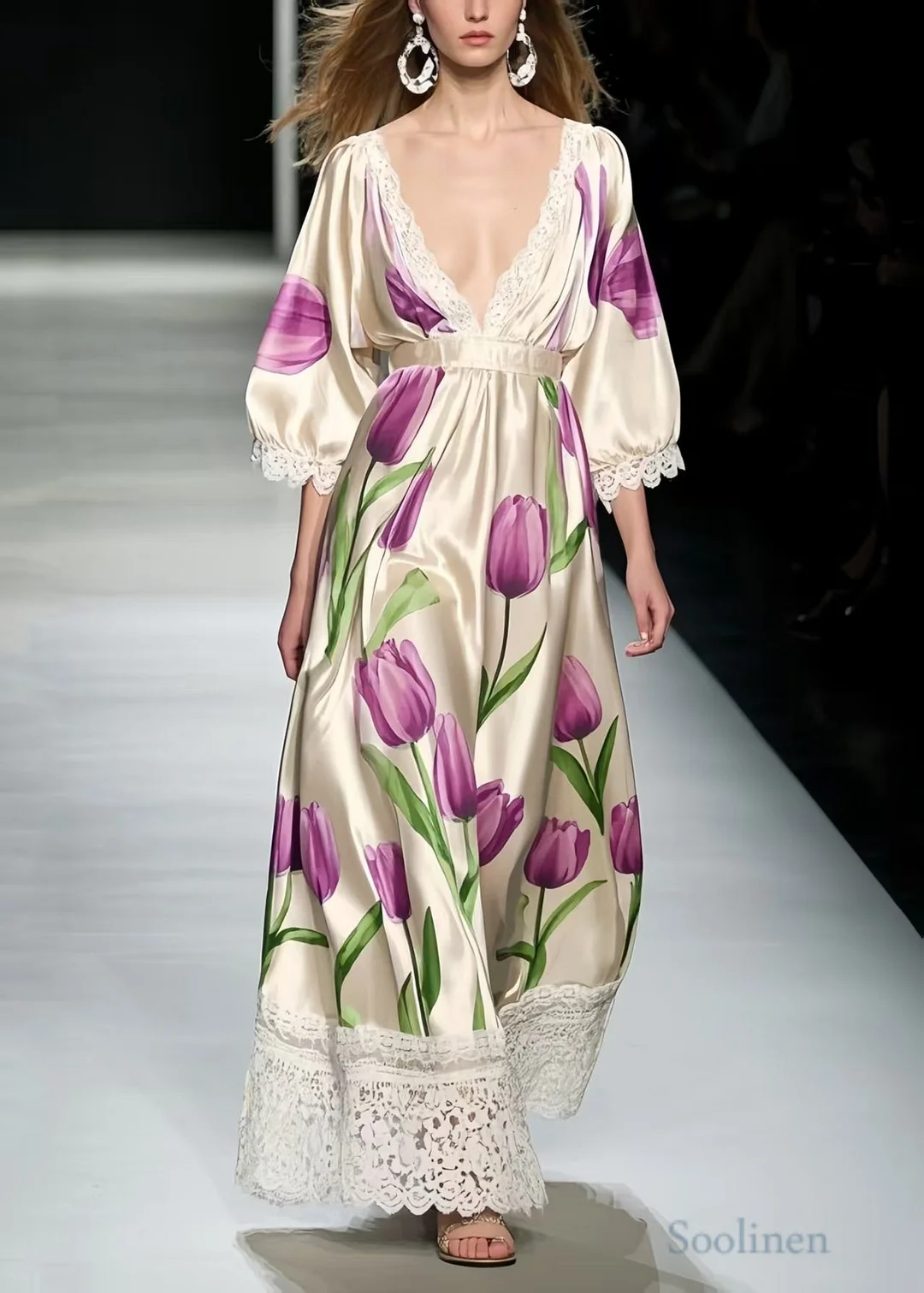 Classy Lavender Floral Patchwork Lace Silk Maxi Dress Summer