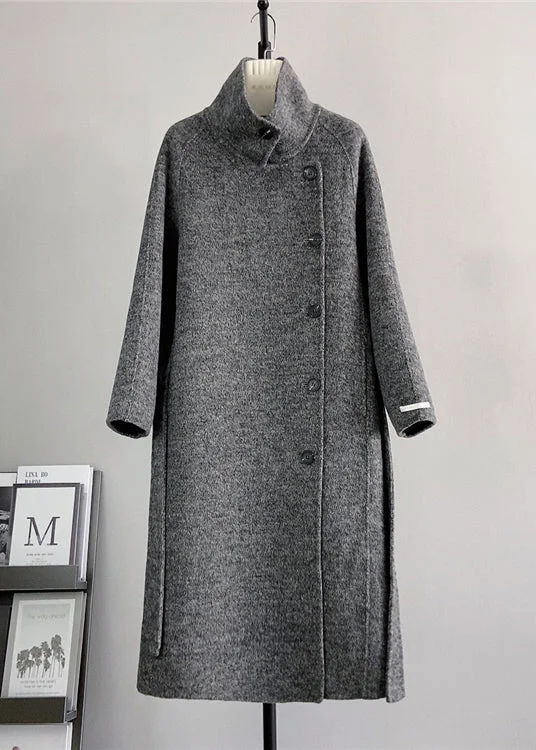 French Grey Stand Collar Button Woolen Outwear Winter