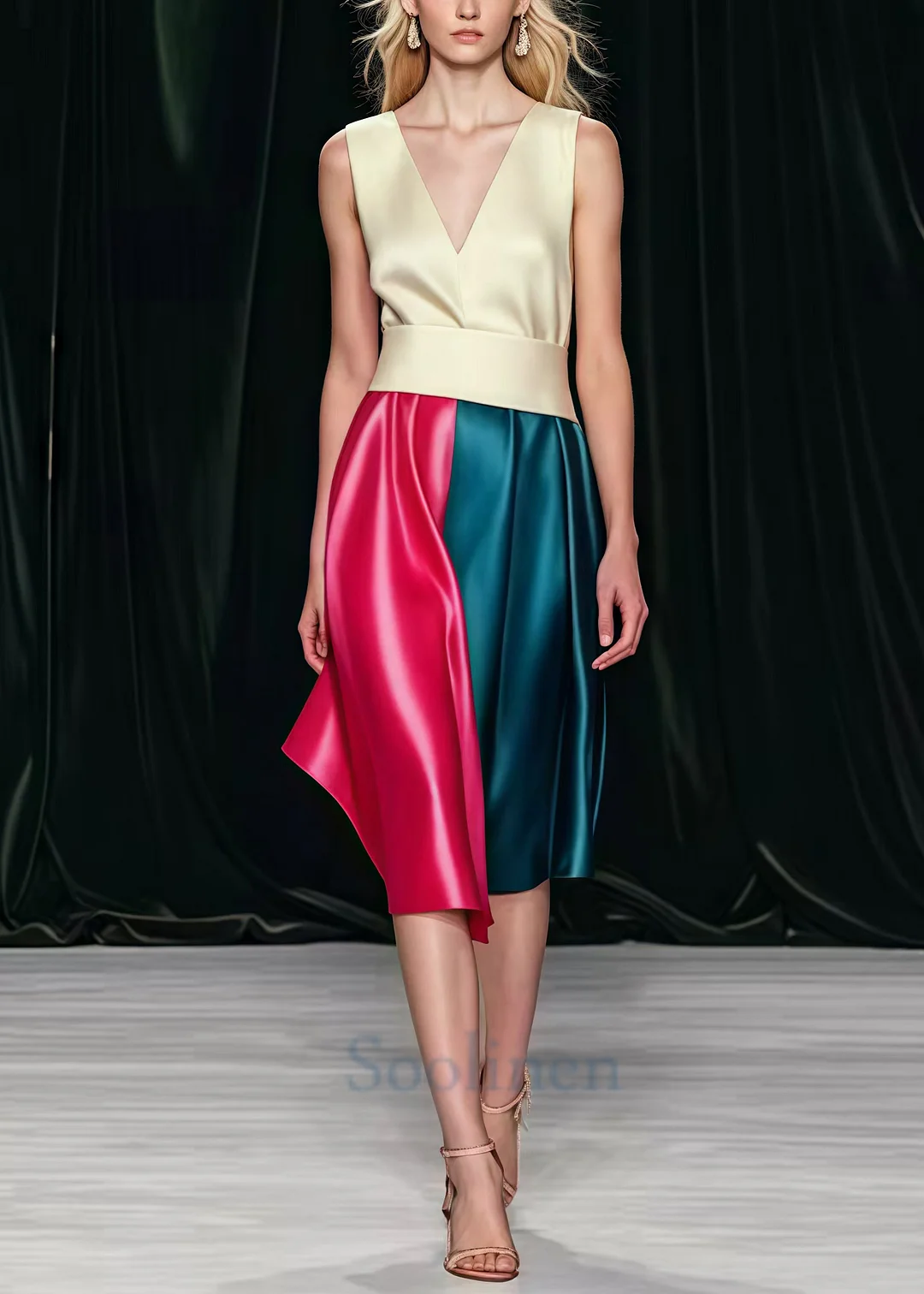 Silm Fit Nude V Neck Patchwork Silk Mid Dress Summer